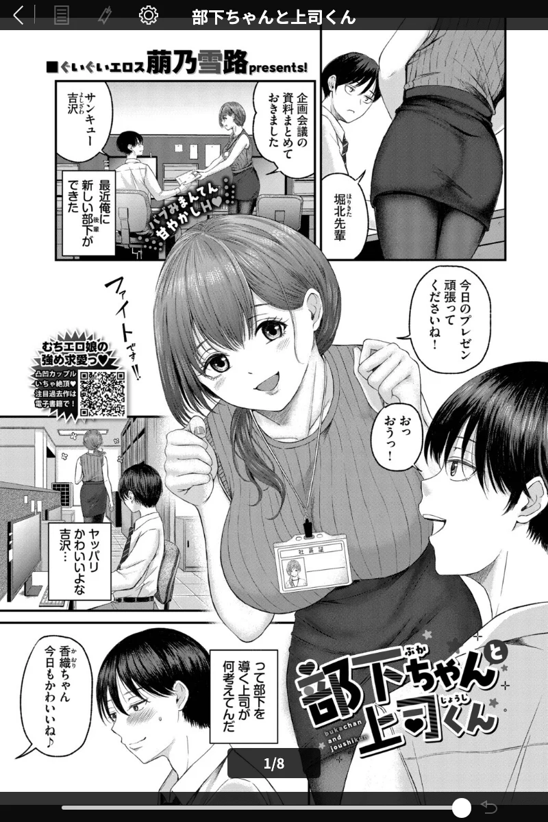 Aはい、「部下ちゃんと上司くん(単話)」のサンプルページを無料でお読みいただけます。全 5 ページのサンプルを公開中です。全編は FANZA でご購入いただけます。