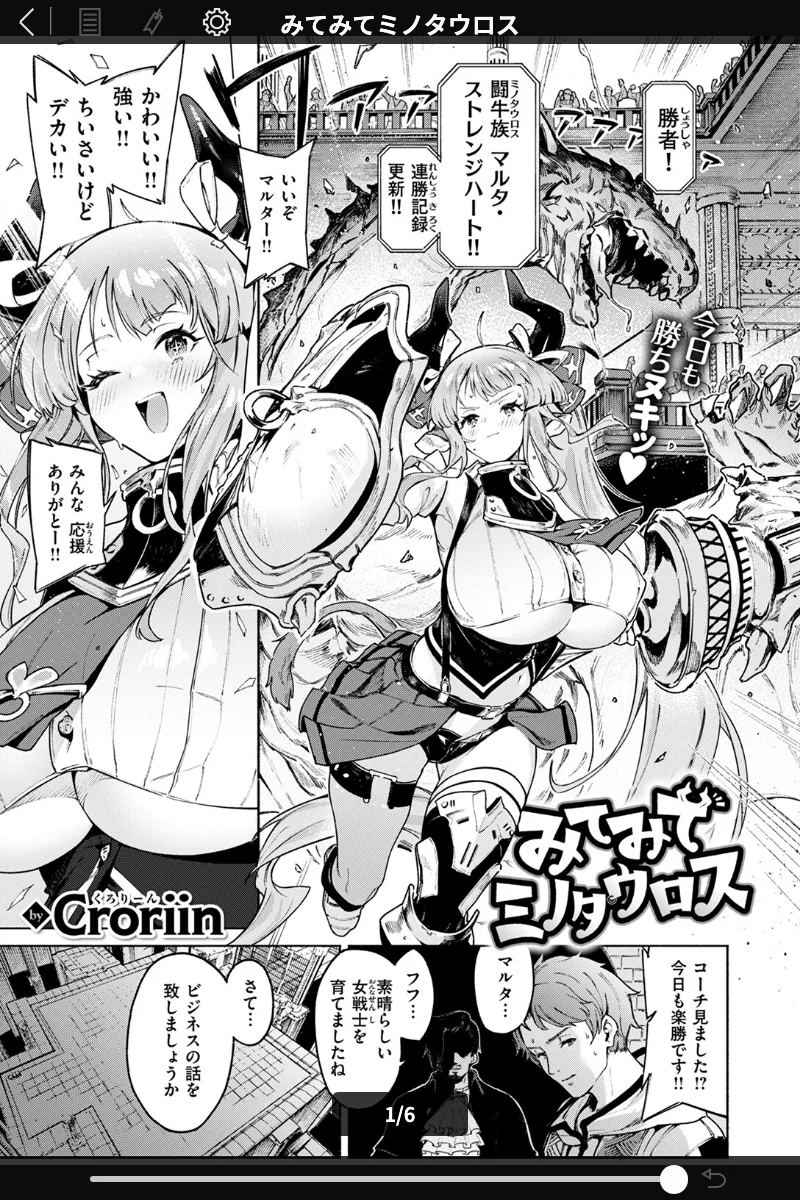 A「みてみてミノタウロス(単話)」の著者は Croriin 先生です。ためコミでは他にも「ヤリこみクロニクル〜異種族性交記〜【デジタル版限定おまけ付き】」「魔女のお気に入り(単話)」などの作品をお読みいただけます。